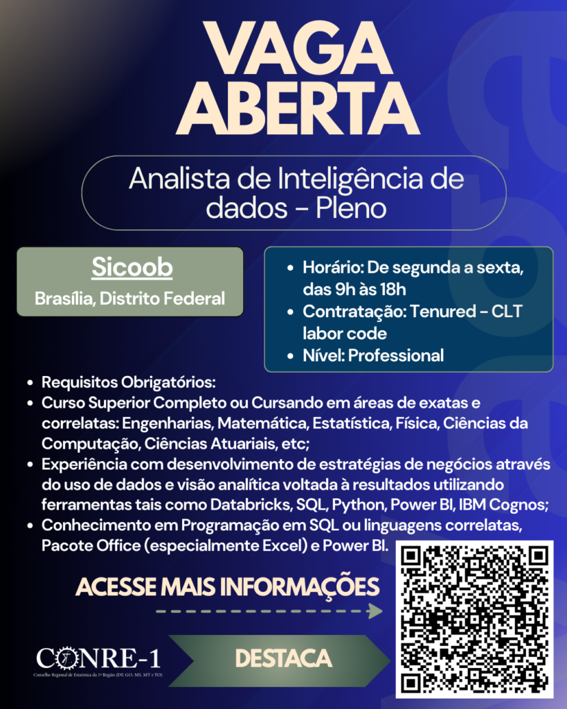 O Conselho Regional de Estatística da 1ª Região (CONRE-1) reforça seu compromisso em apoiar a inserção e a valorização profissional dos estatísticos e profissionais de ciência de dados no mercado de trabalho, divulgando oportunidades relevantes para a categoria.