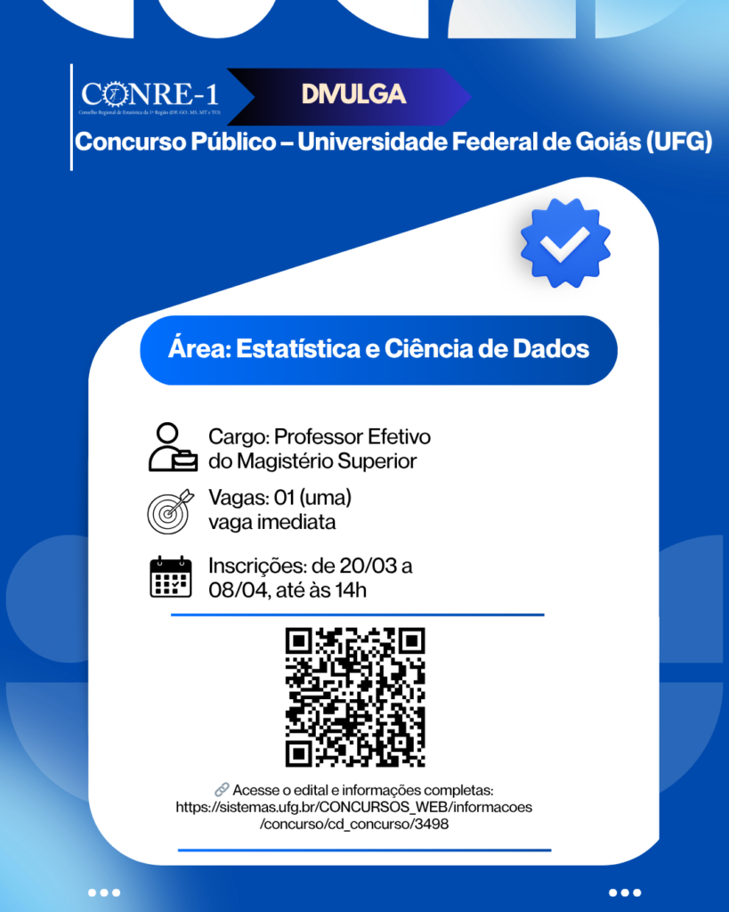 A Universidade Federal de Goiás está com concurso público aberto para Professor Efetivo do Magistério Superior, na área de Estatística e Ciência de Dados. o edital contempla uma vaga imediata, com inscrições até 08/04, às 14h.